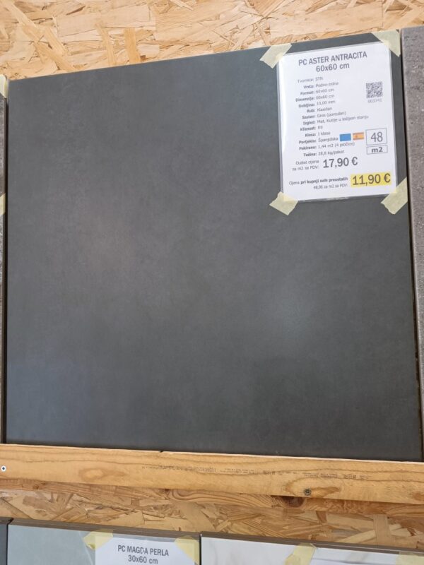 Pločica ASTER ANTRACITA je dimenzija 60x60 cm, debljine 10 mm, klasičnog ruba, napravljena iz gresa (porculan) u tvornici STN. Za upotrebu na .Svaki paket sadrži 1,44 m2 (4 pločice).