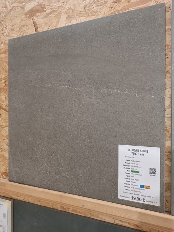 Pločica BELLEVUE STONE je dimenzija 75x75 cm, debljine 9.5 mm, rektificiranog ruba, napravljena iz gresa (porculan) u tvornici STN. Za upotrebu na podovima, zidovima , terasama.