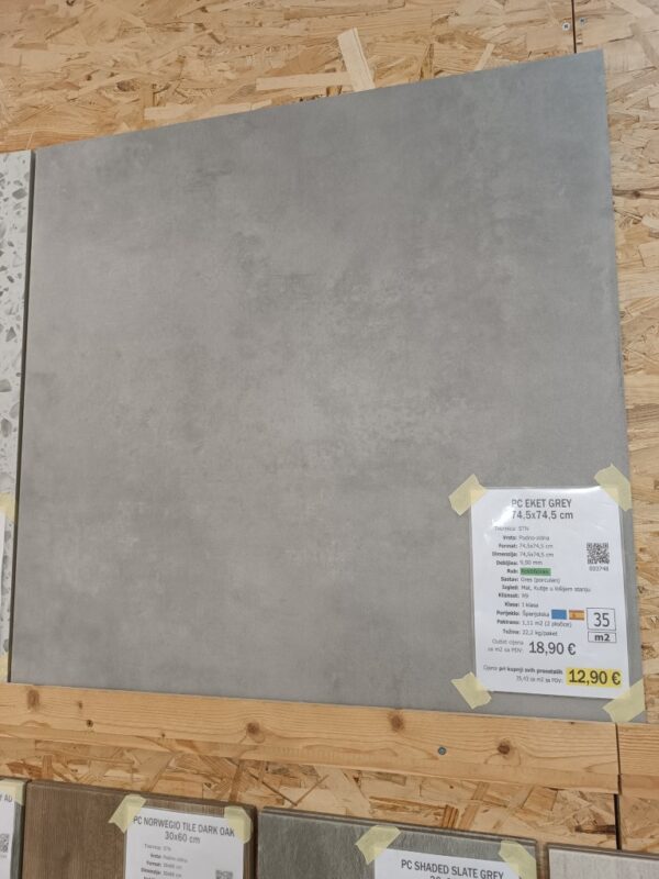 Pločica EKET GREY je dimenzija 74,5x74,5 cm, debljine 9.5 mm, rektificiranog ruba, napravljena iz u tvornici STN. Za upotrebu na .Svaki paket sadrži 1,11 m² (2 pločice).