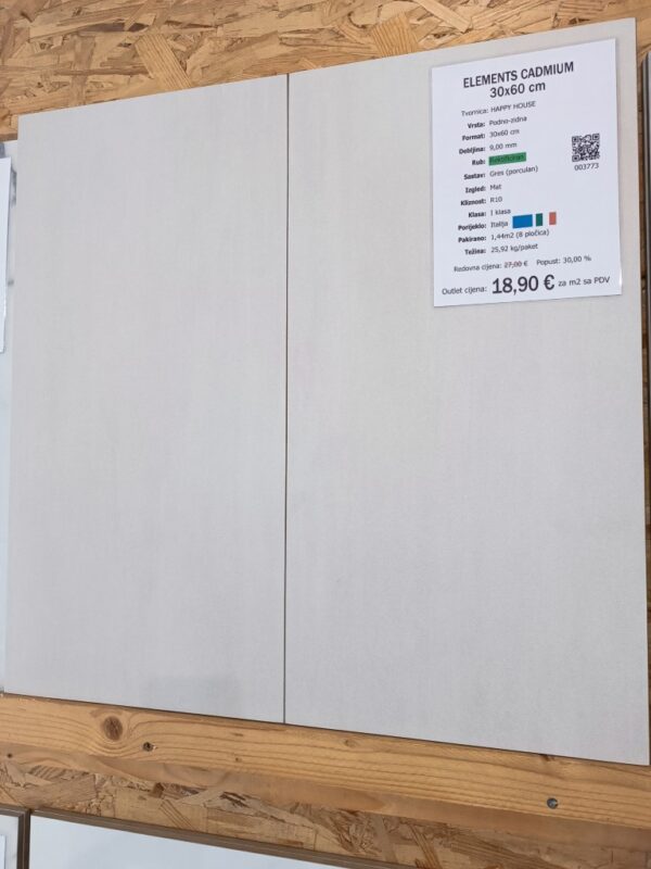 Pločica ELEMENTS CADMIUM je dimenzija 30x60 cm, debljine 9 mm, rektificiranog ruba, napravljena iz gresa (porculan) u tvornici HAPPY HOUSE. Za upotrebu na podovima, zidovima , terasama.Svaki paket sadrži 1,44 (8 pločica).
