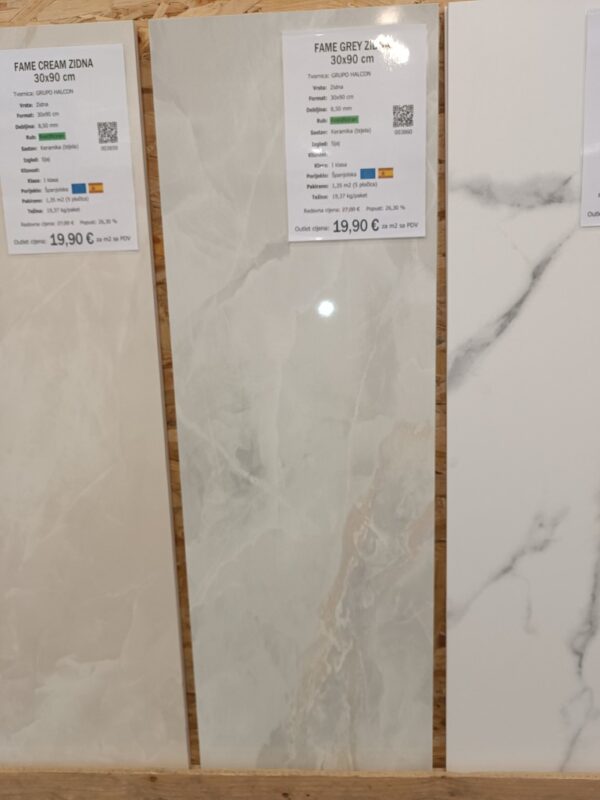 Pločica FAME GREY ZIDNA je dimenzija 30x90 cm, debljine 8.5 mm, rektificiranog ruba, napravljena iz bijele keramike u tvornici GRUPO HALCON. Za upotrebu na zidovima.Svaki paket sadrži 1,35 m2 (5 pločica).