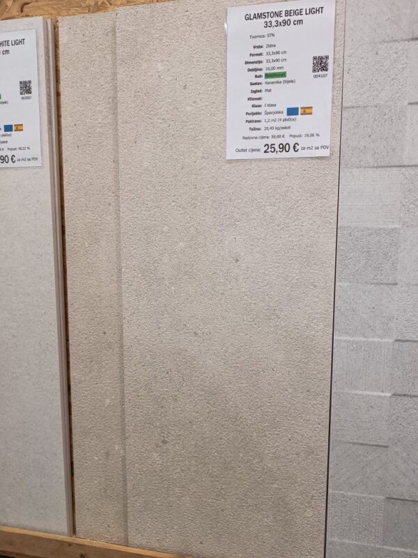 Pločica GLAMSTONE BEIGE LIGHT je dimenzija 33,3x90 cm, debljine 10 mm, rektificiranog ruba, napravljena iz bijele keramike u tvornici STN. Za upotrebu na zidovima.Svaki paket sadrži 1,2 m2 (4 pločice).