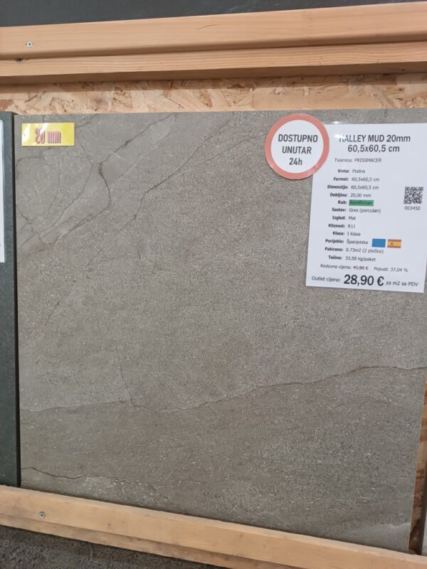 Pločica HALLEY MUD 2CM je dimenzija 60,5x60,5 cm, debljine 20 mm, rektificiranog ruba, napravljena iz gresa (porculan) u tvornici PRISSMACER. Za upotrebu na podovima, zidovima , terasama.Svaki paket sadrži 0,73 (2 pločice).