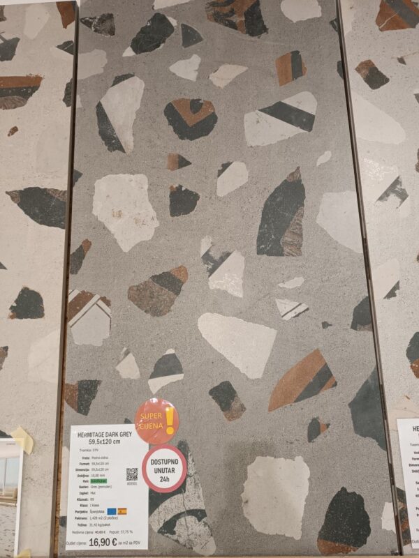 Pločica HERMITAGE DARK GREY je dimenzija 59,5x120 cm, debljine 10 mm, rektificiranog ruba, napravljena iz gresa (porculan) u tvornici STN. Za upotrebu na podovima, zidovima.Svaki paket sadrži 1,428 m2 (2 pločice).