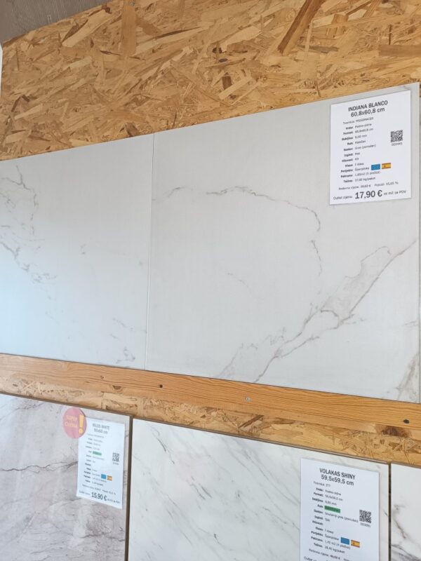 Pločica INDIANA BLANCO je dimenzija 60,8x60,8 cm, debljine 8 mm, klasičnog ruba, napravljena iz gresa (porculan) u tvornici PRISSMACER. Za upotrebu na podovima, zidovima.Svaki paket sadrži 1,85 m² (5 pločica).
