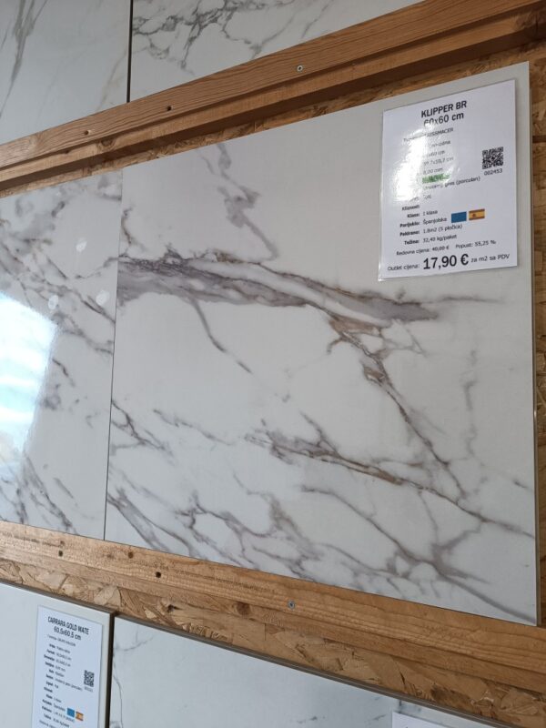 Pločica KLIPPER BR je dimenzija 60x60 cm, debljine 8 mm, rektificiranog ruba, napravljena iz gresa (porculan) u tvornici PRISSMACER. Za upotrebu na podovima, zidovima.Svaki paket sadrži 1,8 m2 (5 pločica).