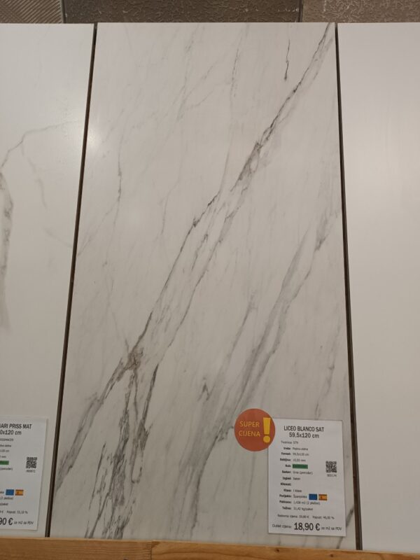 Pločica LICEO BLANCO SAT je dimenzija 59,5x120 cm, debljine 10 mm, rektificiranog ruba, napravljena iz gresa (porculan) u tvornici STN. Za upotrebu na podovima, zidovima.Svaki paket sadrži 1,428 m2 (2 pločice).