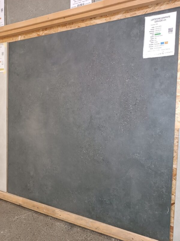 Pločica LOFTSTONE GRAPHITE je dimenzija 120x120 cm, debljine 11 mm, rektificiranog ruba, napravljena iz gresa (porculan) u tvornici STN. Za upotrebu na podovima, zidovima , terasama.Svaki paket sadrži 1,44 m2 (1 pločica).
