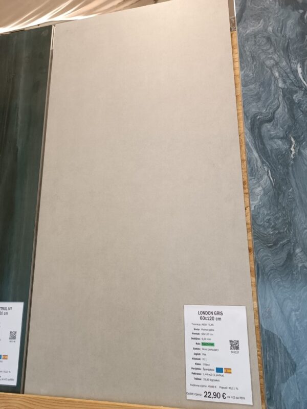 Pločica LONDON GRIS je dimenzija 60x120 cm, debljine 9 mm, rektificiranog ruba, napravljena iz gresa (porculan) u tvornici NEW TILES. Za upotrebu na podovima, zidovima , terasama.Svaki paket sadrži 1,44 m2 (2 pločice).