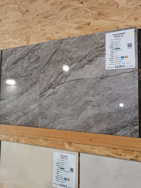 Pločica MILOS ARGENT je dimenzija 60x60 cm, debljine 9.5 mm, rektificiranog ruba, napravljena iz gresa (porculan) u tvornici PRISSMACER. Za upotrebu na podovima, zidovima.Svaki paket sadrži 1,44 m2 (4 pločice).
