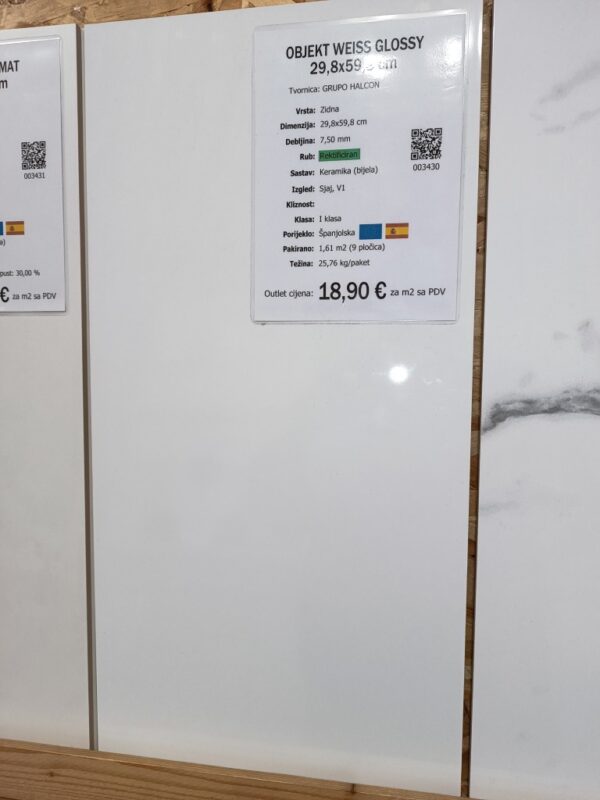 Pločica OBJEKT WEISS GLOSSY je dimenzija 30x60 cm, debljine 7.5 mm, rektificiranog ruba, napravljena iz bijele keramike u tvornici GRUPO HALCON. Za upotrebu na zidovima.Svaki paket sadrži 1,61 (9 pločica).