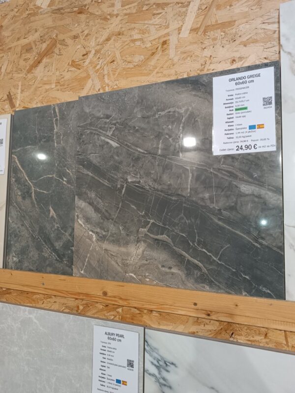 Pločica ORLANDO GREIGE je dimenzija 60x60 cm, debljine 9.5 mm, rektificiranog ruba, napravljena iz gresa (porculan) u tvornici PRISSMACER. Za upotrebu na podovima, zidovima.Svaki paket sadrži 1,44 m2 (4 pločice).