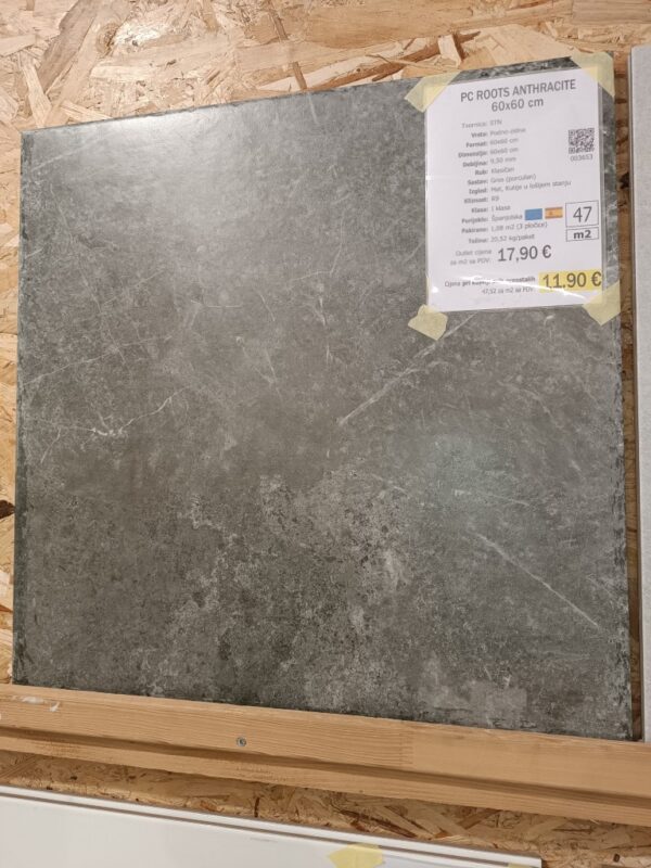 Pločica ROOTS ANTHRACITE je dimenzija 60x60 cm, debljine 9.5 mm, klasičnog ruba, napravljena iz gresa (porculan) u tvornici STN. Za upotrebu na .