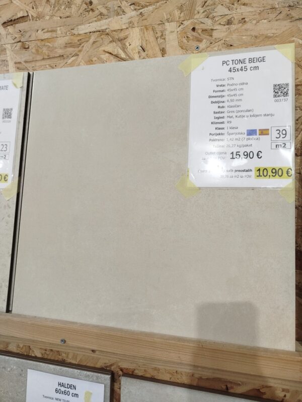 Pločica TONE BEIGE je dimenzija 45x45 cm, debljine 8.5 mm, klasičnog ruba, napravljena iz gresa (porculan) u tvornici STN. Za upotrebu na .Svaki paket sadrži 1,42 m2 (7 pločica).