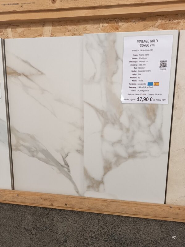 Pločica VINTAGE GOLD je dimenzija 30x60 cm, debljine 8.5 mm, klasičnog ruba, napravljena iz gresa (porculan) u tvornici GRUPO HALCON. Za upotrebu na podovima, zidovima.Svaki paket sadrži 1,44 (8 pločica).